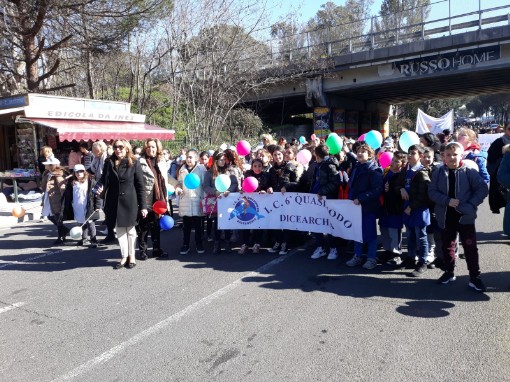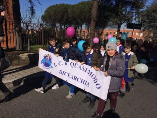 Venerdi 16 febbraio 2018 il Dirigente Scolastico Prof.ssa Antonietta Prudente , gli alunni e le docenti delle classi quinte di scuola primaria del'I.C.6°QUASIMODO DICEARCHIA, hanno partecipato alla marcia per la legalita': " Il silenzio uccide piu' dell' illegalita' " per dire no alla Camorra e a ogni forma di delinquenza. I bambini con i loro palloncini hanno colorato la manifestazione che si e' snodata per l' intero quartiere di Monteruscello con il coinvolgimento di tutta la citta' flegrea, dall' amministrazione con il Sindaco, gli assessori e tutti i consiglieri comunali, dalla Curia arcivescovile, alle associazioni, alle organizzazioni sindacali, ai comitati civici e semplici cittadini. |